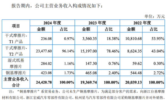 其中,干式离合器摩擦片是科马材料的核心收入来源。据《招股书》,2022年至2024年,科马材料干式摩擦片销售收入占主营业务比重高达96.9%、96.8%和97.1%,几乎支撑起公司全部业绩。相比之下,新拓展的湿式摩擦片业务规模尚小,2022年5月才开始投产销售,在报告期内贡献的收入比例微乎其微。